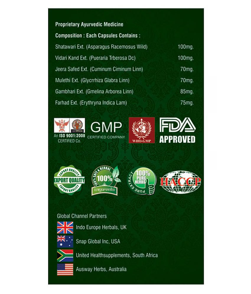 - Ingredients:Shatawari, Vidari Kand, Jeear Safed, Mulethi, Gambhari, Farhad
