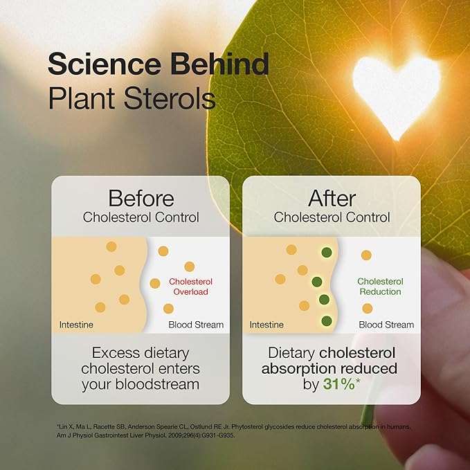 - PATENTED & CLINICALLY TESTED PLANT STEROLS: A natural blend of Standardised and clinically tested plant-based Phytosterols - CoroWise & Vegapure, proven to lower LDL cholesterol levels and improve HDL cholesterol levels. Cholesterol control takes a comprehensive approach to cholesterol management by targeting multiple aspects of cholesterol regulation, including absorption, metabolism, and antioxidant defence. Plant sterols help control cholesterol metabolism and manage cholesterol effectively. It protects against oxidative stress and support cardiovascular health.