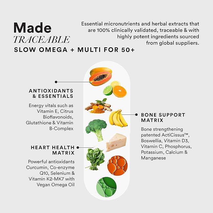 - CONSCIOUSLY CURATED BLEND OF 39 ESSENTIAL NUTRIENTS: Multi + Omega 50+ Slow delivers 39 clinically validated nutrients, including essential vitamins, minerals, and pure vegan omega oil, to support heart health, cognitive function, and mobility. Designed for adults over 50, this advanced formula provides sustained nourishment to strengthen bones, protect vision, and promote overall vitality.