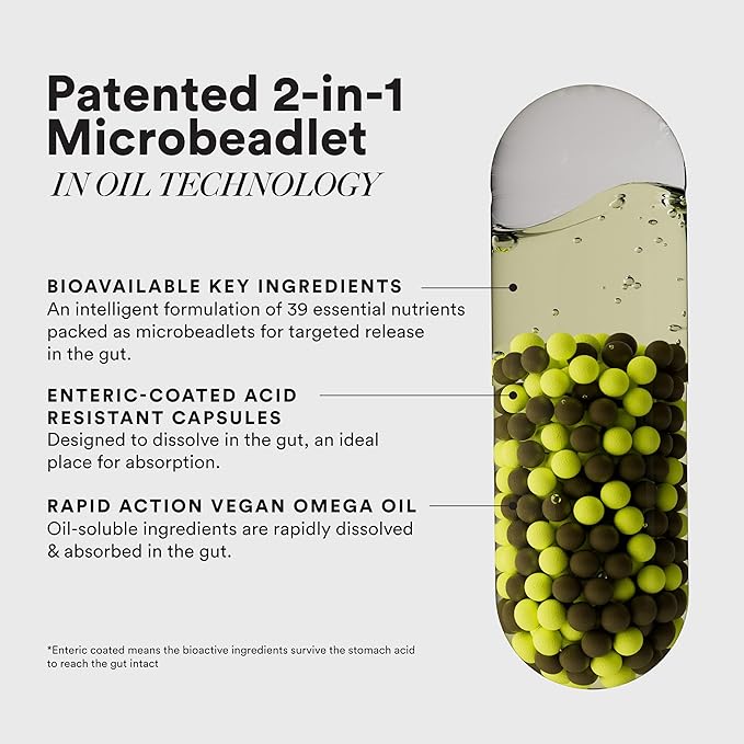 - ADVANCED 2-IN-1 SLOW-RELEASE TECHNOLOGY FOR MAXIMUM ABSORPTION: Multi + Omega 50+ Slow is crafted with innovative slow-release technology, providing a steady and sustained absorption of its nutrients throughout the day. The blend of fast-absorbing vegan omega oil with slow-release beadlets enhances bioavailability, ensuring optimal absorption in the gut’s less sensitive areas for maximum effectiveness.